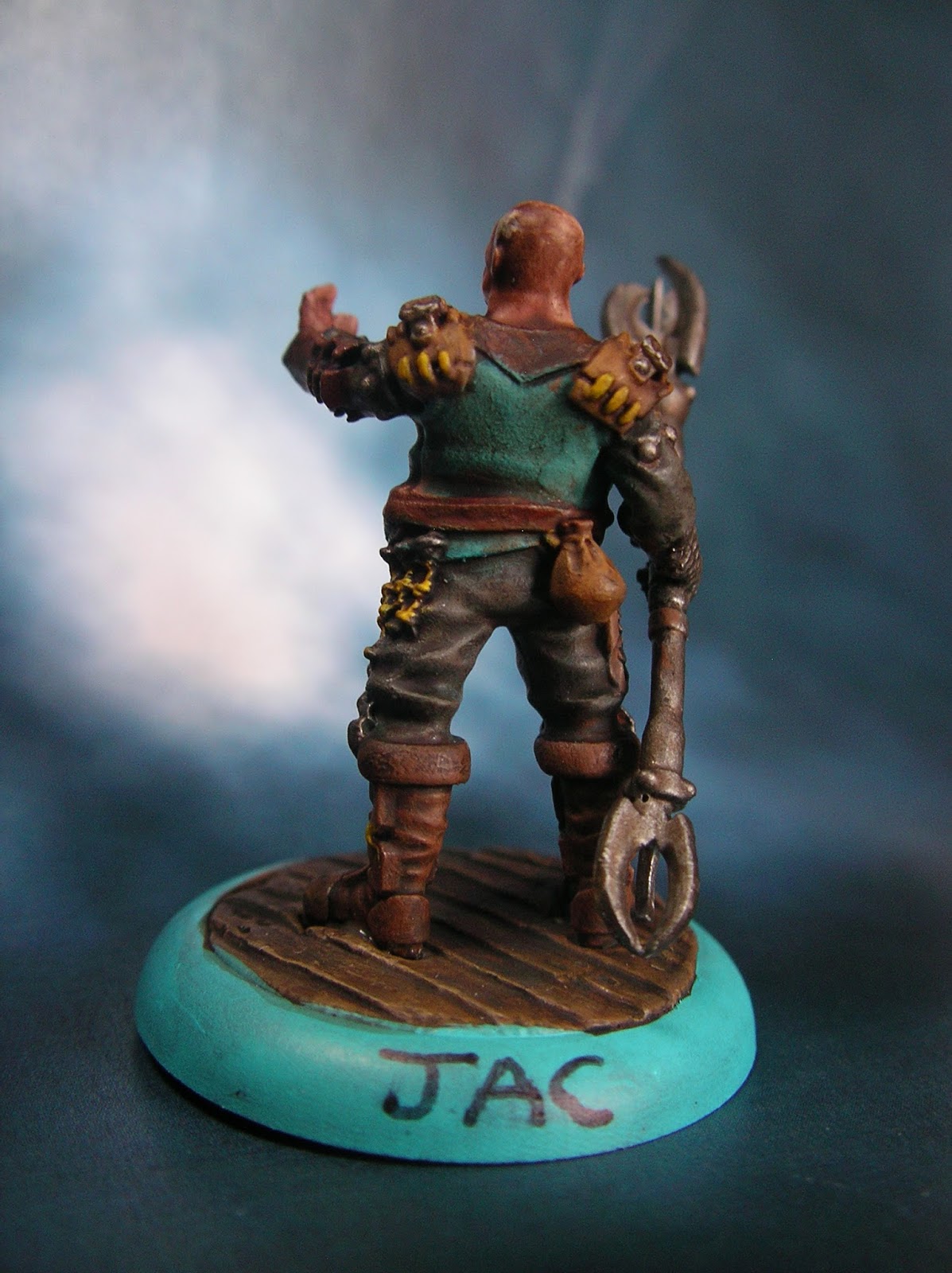 Primed white, skin painted with Khardic Flesh then drybrushed with Midlund Flesh and lightly drybrushed with Ryn Flesh. Outfit was painted with Cryx Bane Base then drybrushed with Cryx Bane Highlight. Leather parts painted with Umbral Umber and drybrushed with Bloodstone. Blue parts painted with Meridius Blue and drybrushed with Arcane Blue and lightly drybrushed with a mix of Arcane Blue and Frostbite. Metal parts painted with Pig Iron and drybrushed or highlighted with Quicksilver.