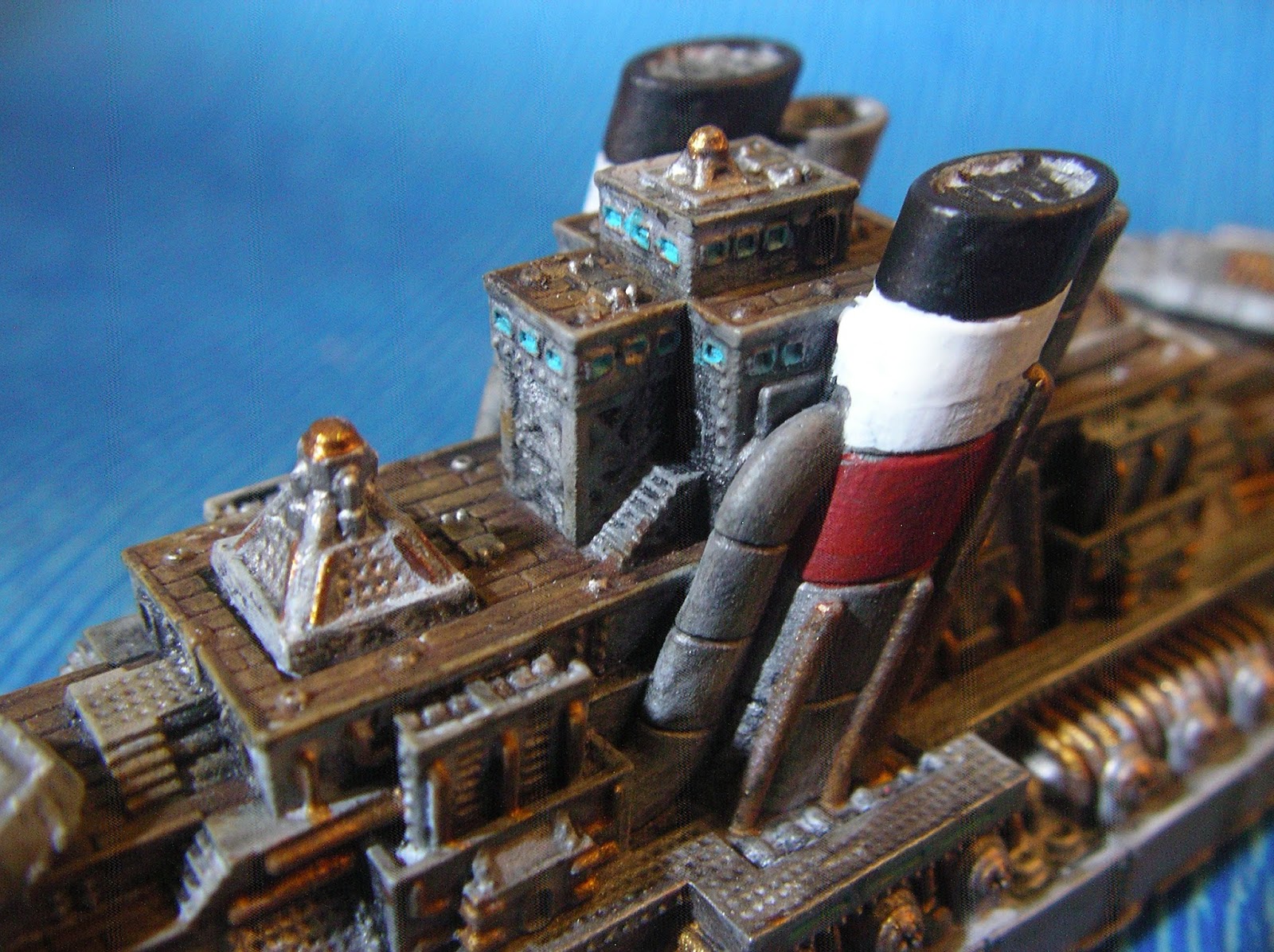 windows. Thamar Black was used on the iron cross. The whole model was then washed with GW Nuln Oil. The water was painted with dollarstore blue paints.