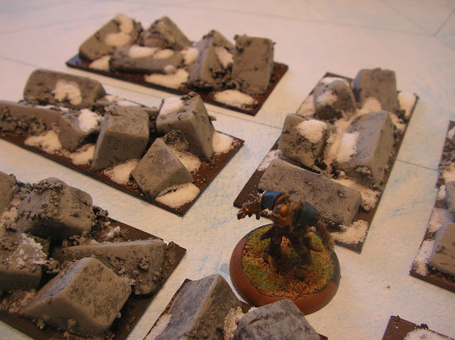 I then mixed glue, grit, and black temera paint i had lying around to give some smaller rubble texture. I then drybrushed the rocks dark grey and lightly brushed them grey. The ground I painted dark brown. I added some snow on fresh craft glue to areas and acheived the snow effects. The Army Painter battlefield snow worked best.